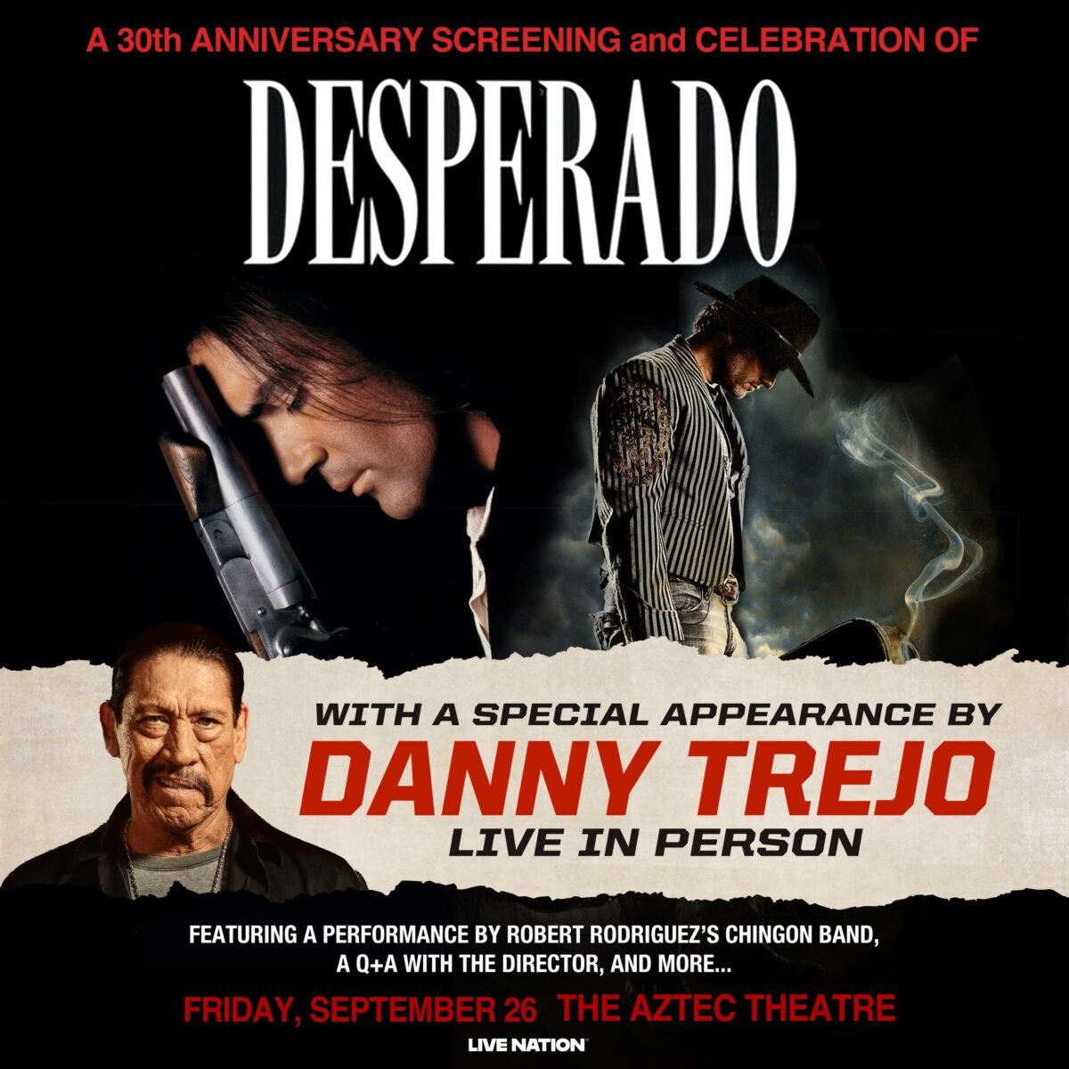 Join director Robert Rodriguez and Danny Trejo at the Aztec Theater in San Antonio for the 30th Anniversary screening of DESPERADO! Robert and Danny will do a Q&A followed by CHINGON performing a special set of music and imagery!
